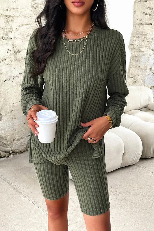 Devine Ribbed Round Neck Dropped Shoulder Top and Shorts Set